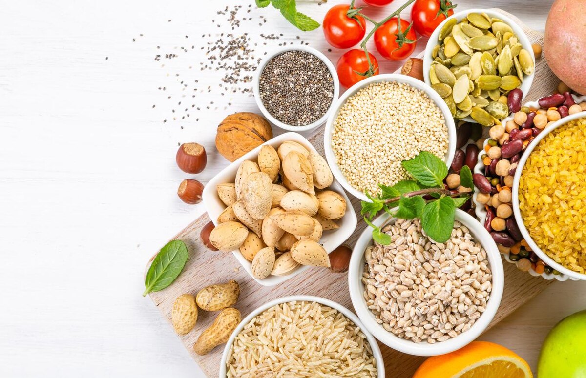 - Крупы: гречка, овес, ячмень, бурый рис и другие цельнозерновые продукты являются главными.