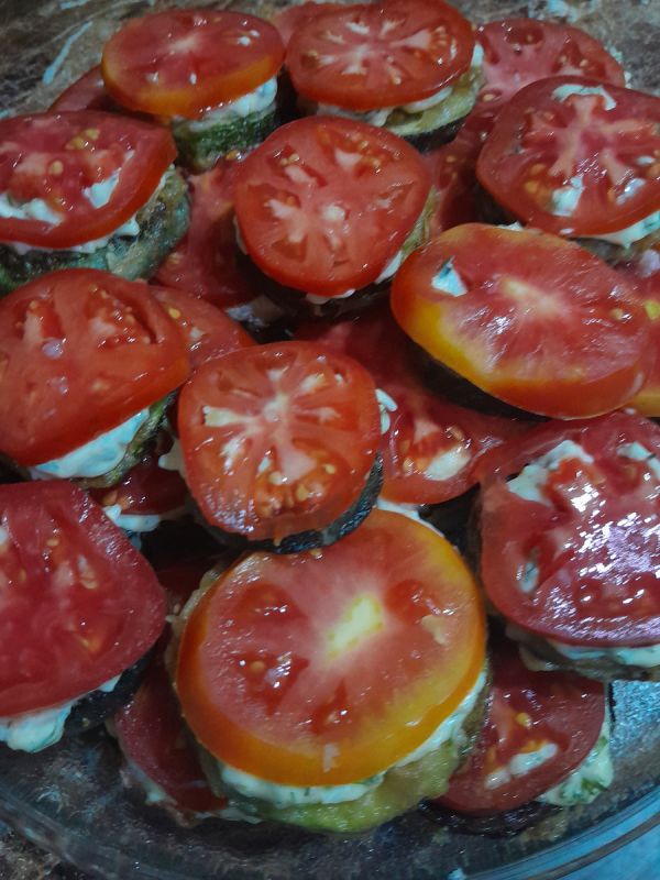 Собираем закуску прямо перед подачей: на каждый кружок — немного чесночного соуса, сверху помидорка. Готовность — когда баклажан тёплый, а помидор — свежий и сочный.