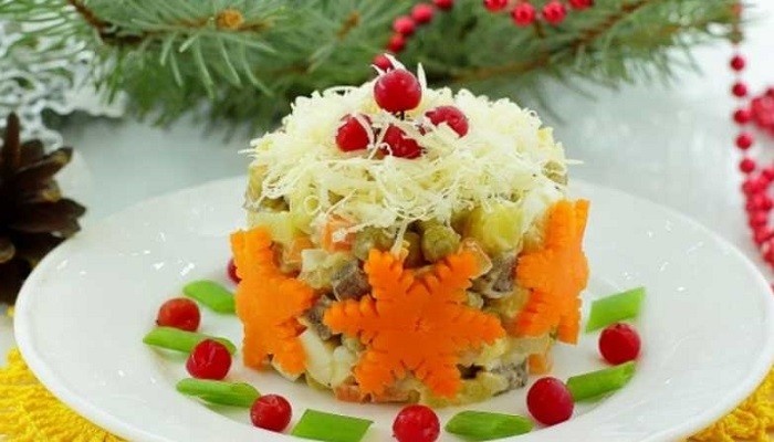 При подготовке ингредиентов важно заранее отварить овощи и мясо, чтобы они успели остыть. Затем все компоненты нарезаются кубиками, добавляется горошек и заправляется все майонезом. Салат можно украсить зеленью и подавать к столу.