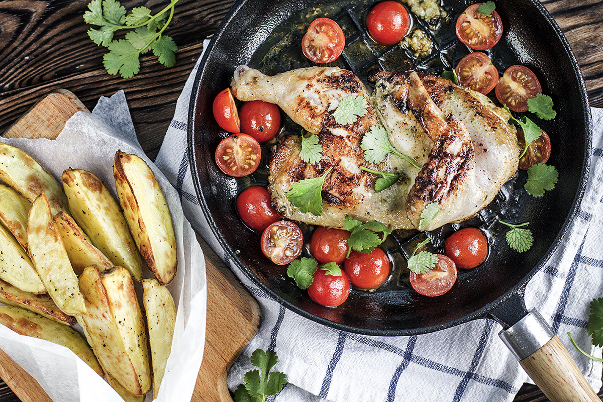 4. Разрежьте помидоры черри пополам и мелко нарежьте кинзу. В конце добавьте их на сковороду с цыпленком и жарьте ещё 1-2 минуты. На сервировочную тарелку выложите картошку, а сверху — цыпленка, украсив оставшейся кинзой.