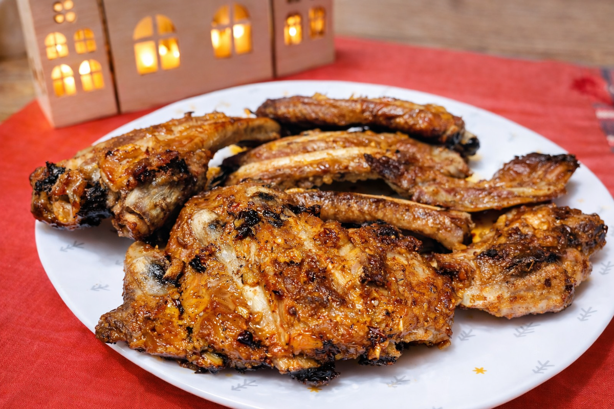 1. Подготовка рёбер: Охлаждённые рёбра тщательно промыть и обсушить. Разрезать на куски с 2-3 косточками в каждом. Крупные куски обеспечивают лучшую сочность.