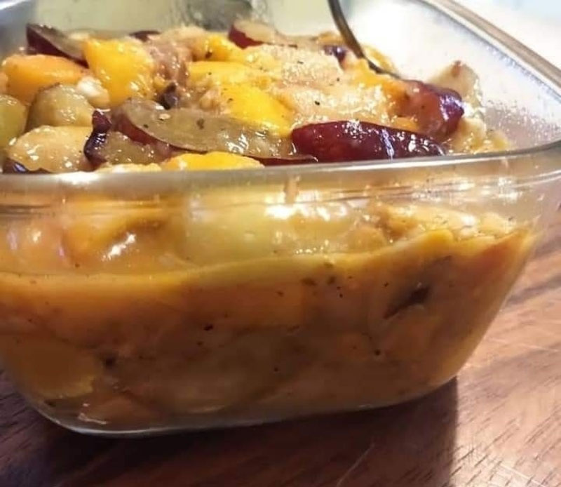 Нарезанные крупными кубиками (~2 см) яблоки обжариваются на сухой сковороде 2-3 минуты, до легкого подрумянивания и карамелизации сахаров. Далее к ним добавляются мелко нарезанные слива, персик, киви, чеснок и имбирь, которые прогреваются не более минуты на огне.