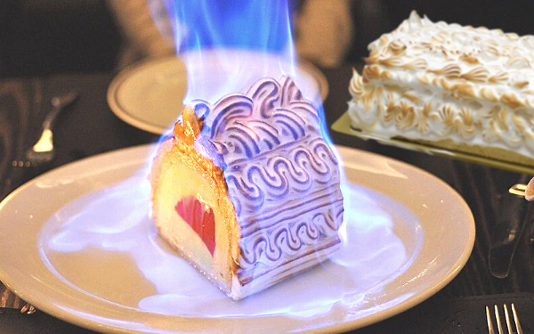 Хотя конечный результат мог отличаться от задумки шефа, сам торт, представляющий собой мороженое на бисквите женуаз, покрытое фламбированной итальянской меренгой с добавлением Гран Марнье, оказался настоящим восхищением.