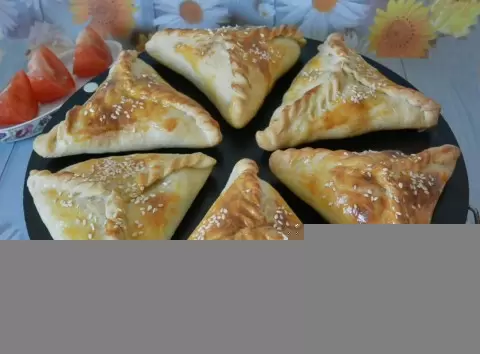 Параллельно готовится тесто, в которое входят маргарин, сметана и сахар. После замеса тесто делят на небольшие кусочки и раскатывают в круглые лепешки.