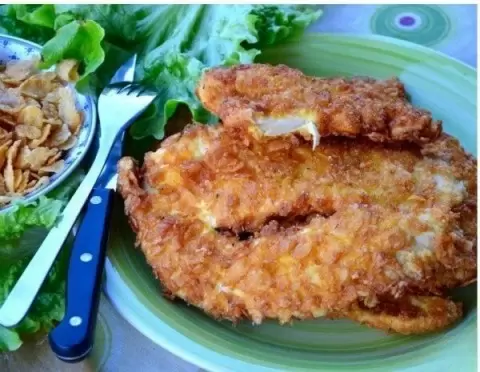 Разогрейте достаточное количество растительного масла в глубокой сковороде. Когда оно достигнет хорошей температуры, приступайте к панировке: обваляйте отбивную в муке, затем в яйцах и, наконец, в кукурузной крошке с сыром. После этого аккуратно опустите отбивную в горячее масло.
