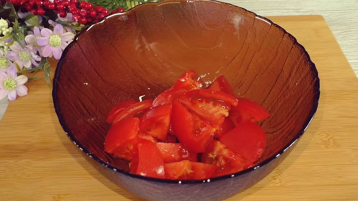Для начала овощи нарезаются: помидоры следует разрезать произвольно, но не слишком мелко. Если они кислые, можно добавить немного сахара. Затем добавляем нарезанные огурцы и болгарский перец.