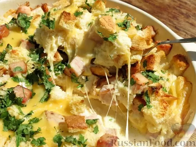 Запеканка из хлеба с колбасой и сыром. Легко готовится и удивляет своим вкусом: хрустящие сухарики, сочная колбаса и расплавленный сыр делают эту запеканку отличным вариантом для сытного завтрака.