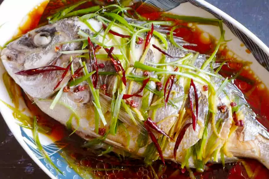 Нарезать зеленый лук, имбирь и сушеный чили перец соломкой.Очистить рыбу от чешуи и внутренностей, тщательно промыть. Сделать поперечные надрезы под углом 45 градусов с обеих сторон, поместив рыбу на блюдо для приготовления.Вложить треть нарезанного лука и имбиря внутрь рыбы, остальной ингредиент разложить сверху и вокруг.Готовить на пару 8-10 минут, после чего аккуратно слить лишнюю жидкость.В сотейнике на медленном огне разогреть растительное масло с сушеным чили и сычуаньским перцем. Как только появится лёгкий дымок, полить рыбу этим маслом (специи можно использовать по вкусу).В этот же сотейник добавить светлый соевый соус, шаосинское вино, сахар и молотый черный перец. Нагревать до закипания и полить рыбу получившимся соусом. Блюдо готово!Приятного аппетита!