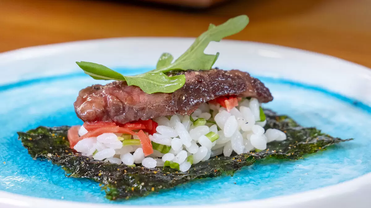 На лист нори выкладывается рис, затем соломка имбиря и кусочек говядины. Наконец, посыпаем черным перцем и украшаем листиком рукколы.