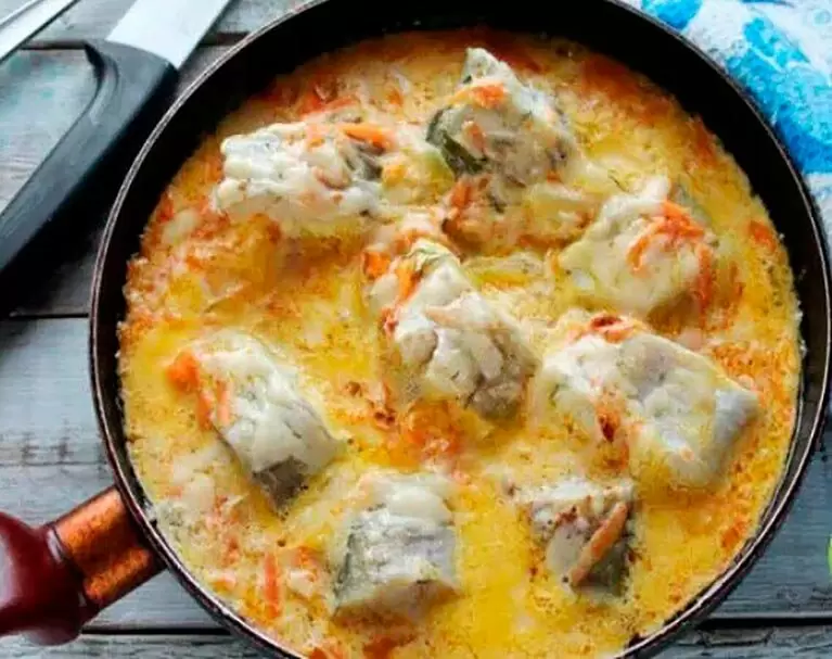 На каждую рыбу положить немного обжаренной моркови и щедро полить сметанным соусом. Накрыть сковороду крышкой, уменьшить огонь и тушить около 15 минут.