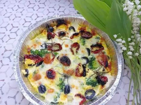 Следующий шаг — укладка вяленых томатов и маслин поверх брокколи. Моцареллу нарезают небольшими кусочками и добавляют к остальным ингредиентам. В отдельной миске яйца взбиваются с молоком, постепенно добавляется крахмал. Полученную массу нужно солить и приправлять по вкусу, а затем залить ею овощи в форме.