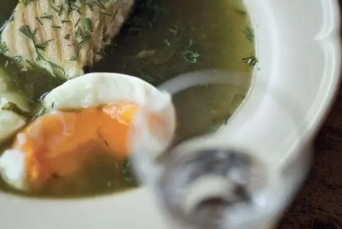 Темпераментные ерши нужно хорошо промыть, выпотрошить и удалить жабры. Чешую не обязательно чистить. Положите рыбу в большой котел, залейте холодной водой и варите на среднем огне около 2 часов.Осетрина требует тщательной подготовки: промыть, потереть шеточкой или куском мешковины для удаления слизи. После этого отрежьте голову, хвост и плавники, которые отправятся в котел к ершам для бульона. Подготовленную рыбу уберите в холодильник.Когда юшка будет готова, процедите её через льняную ткань. Перелейте в кастрюлю и доведите до кипения, добавьте осетру и варите ещё 5 минут. Выключите огонь и дайте остыть. Отдельно соберите осетрину.Лук-порей нарежьте и пассеруйте в растительном масле до мягкого состояния. Затем добавьте нарезанный шпинат, продолжайте готовить, пока он не размягчится.Щавель нарежьте мелко и добавьте в кастрюлю, когда шпинат станет готов. В отдельной кастрюле сварите яйца до состояния «в мешочек», а затем очищайте.Разделите осетрину на куски и добавьте к зелени рыбный бульон, снова доведите до кипения и выключите.Не забудьте измельчить укроп, сервируйте суп в тарелках, добавляя по половинке яйца и кусок осетрины.Эти щи подарят вам незабываемое наслаждение в каждую ложку!