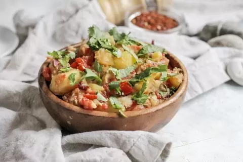 В большой миске объедините испеченные баклажаны, болгарский перец, картофель, лук и часть кинзы. Заправьте горячим томатным соусом и приправьте по вкусу солью. Перемешайте и украсьте оставшейся кинзой перед подачей.