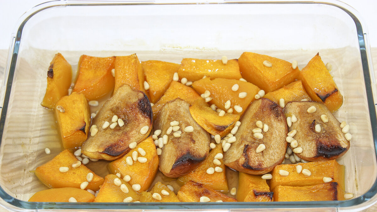 3. Не забудьте обжарить кедровые орехи. Когда тыква с айвой будет готова, посыпьте их орехами и полейте ароматным соком и карамелью, образовавшимися при запекании.