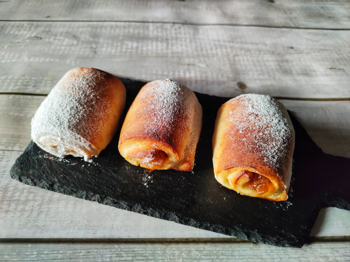 На край каждой части выкладывается повидло, и их нужно аккуратно скатать в трубочки, затем уложить на противень швом вниз. Выпекать булочки следует около 25 минут. В результате получатся румяные и аппетитные изделия, которые можно посыпать сахарной пудрой перед подачей.