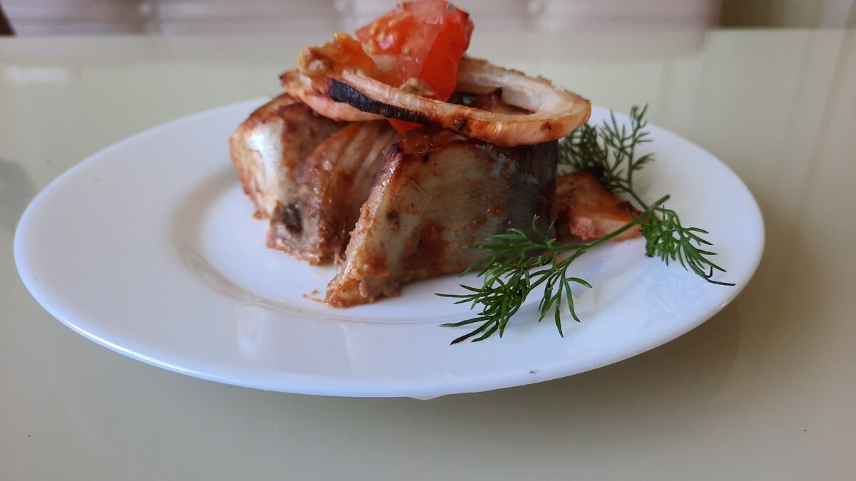 После маринования выложить скумбрию в форму для запекания. Между кусочками рыбы положить лук и помидоры, чтобы создать чудесный баланс и дополнить вкус блюда. Выпекать в разогретой до 170-180 градусов духовке в течение 30 минут. За 10 минут до готовности можно снять фольгу, если она использовалась.