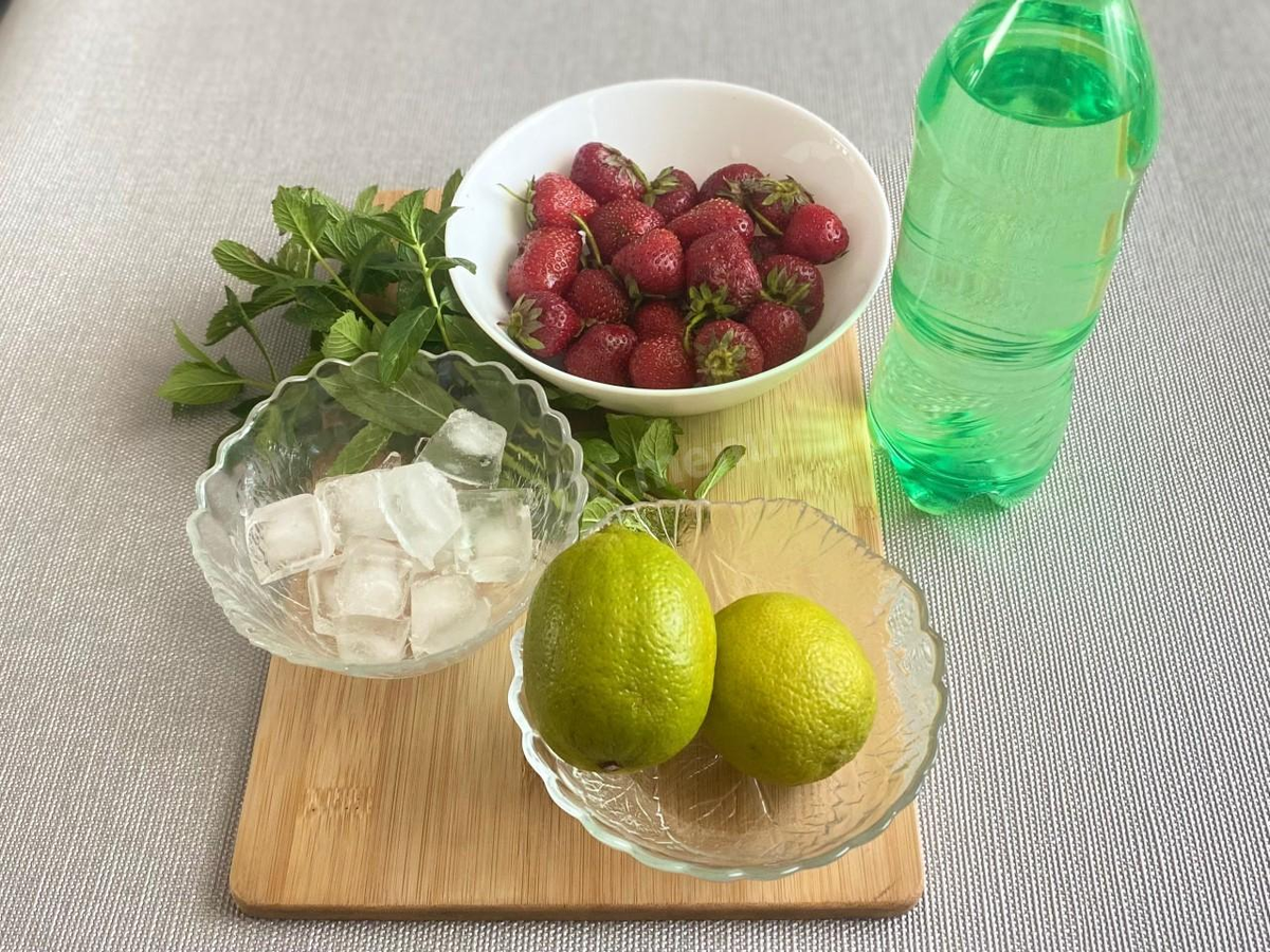 Шаг 1: Начать стоит с подготовки ингредиентов. Тщательно промыть лаймы, клубнику и мяту, обсушить. Чтобы напиток выглядел эффектно, отложите несколько ягод и мятных листьев для украшения.