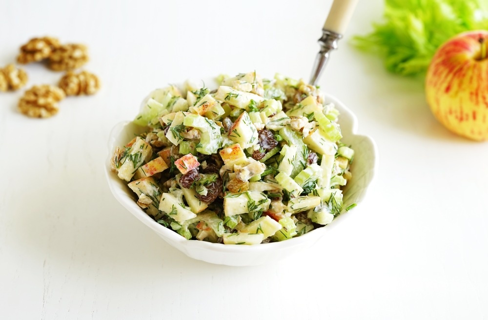 Приготовление не займет много времени: просто нарежьте яблоки и сельдерей, добавьте орехи, изюм, зелень и полейте всё греческим йогуртом с лимонным соком. В результате получится легкий, вкусный и очень приятный на вкус салат, который прекрасно подойдет как для ужина, так и в качестве закуски к мясным блюдам.