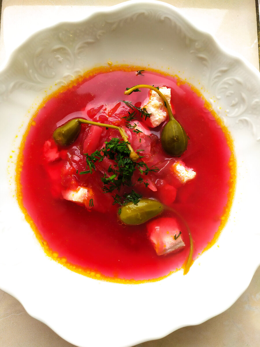 Когда бульон варится, натереть свеклу на терке, добавить лимонный сок и тушить до готовности. В кипящий бульон добавить капусту, варить 15 минут, затем добавить лосось и спассированные овощи. В завершение влить тушеную свеклу и приправить по вкусу.