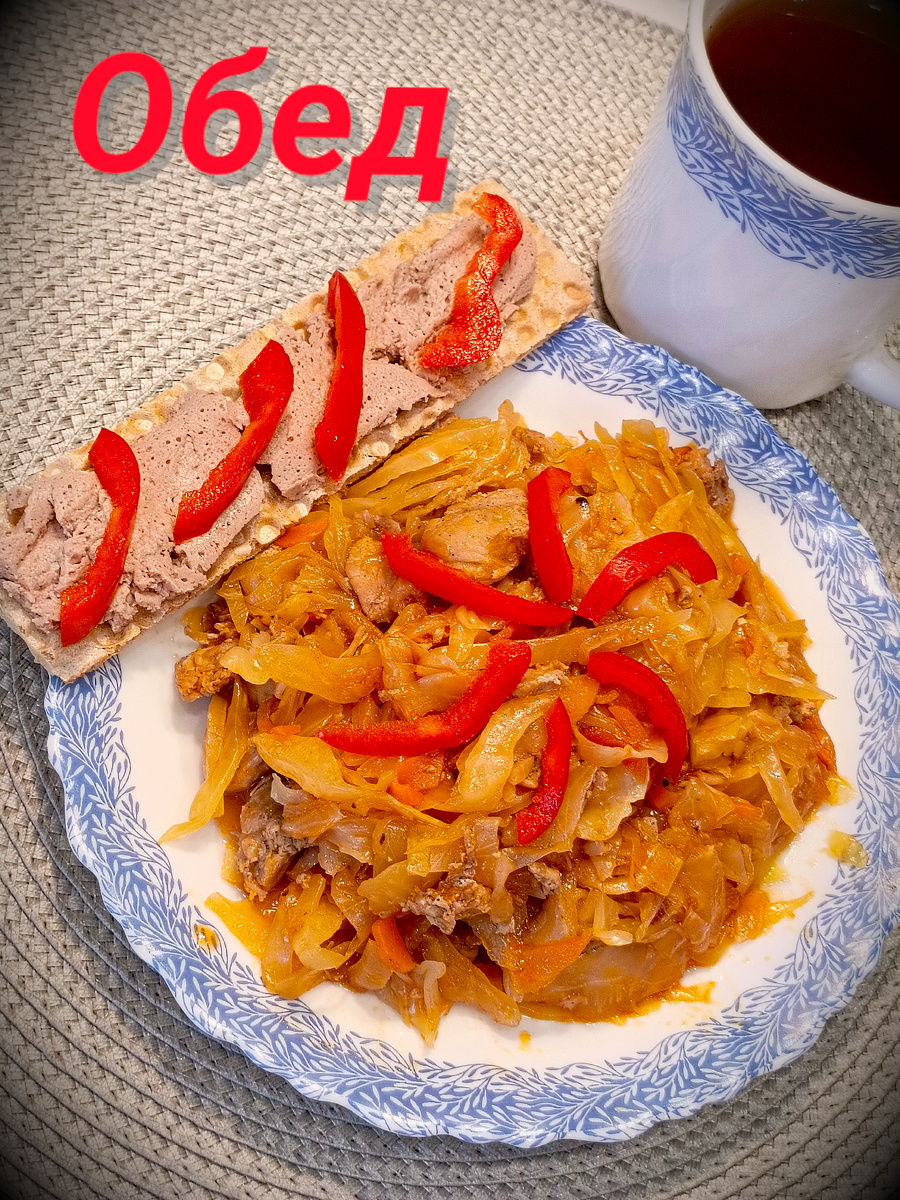 Сегодня на обед готовили ароматную тушёную капусту с индейкой, которую приобрели накануне. Блюдо получилось не только быстрое, но и очень аппетитное. К всем ингредиентам добавили ржаной хлебец, намазанной паштетом из индейки из свежей распаковки. Сверху украсили блюдо полосками сладкого перца, что сделало его ещё более привлекательным. Таким изысканным обедом насладились под чашечку чая с бергамотом, который добавил особый шарм моменту.