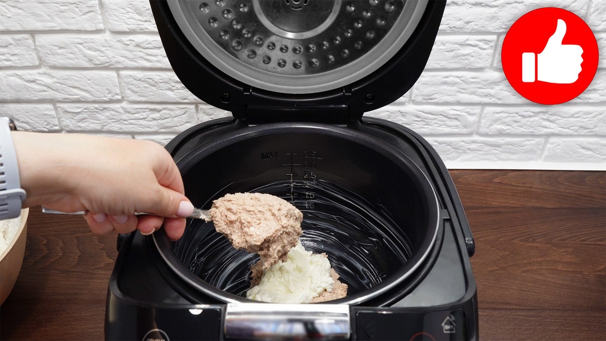 На этом этапе тесто делится на две равные части: в одну из них добавляется какао-порошок, а затем все тщательно перемешивается. Затем наступает самый интересный момент: в заранее смазанную маслом чашу мультиварки выкладываем тесто небольшими порциями по 2 столовые ложки, чередуя слои темного и светлого теста. Продолжаем до тех пор, пока тесто не закончится.