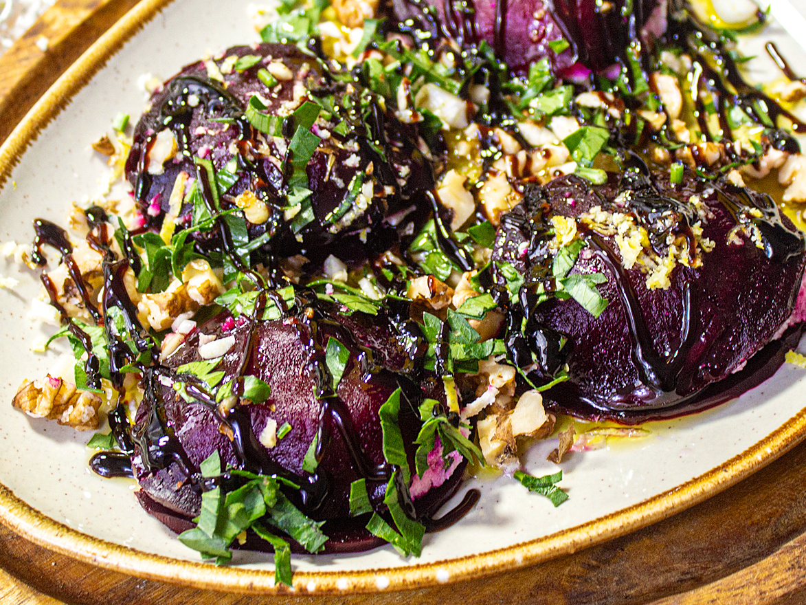 Так, чтобы оптимизировать процесс на кухне, рекомендуется всё подготовить заранее. Для начала нужно запечь две свёклы среднего размера, завернув их в фольгу, при температуре 180 градусов около 40 минут. После этого дайте им остыть и очистите.