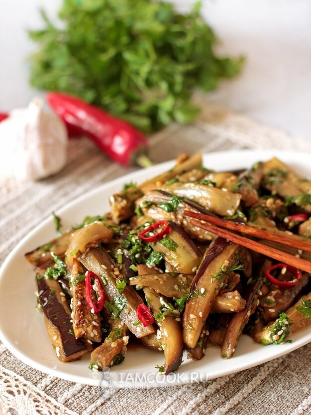 Запеченные баклажаны немного остудите и смешайте с приготовленной приправой. Поместите в контейнер, накройте и оставьте в холодильнике на ночь для настаивания.