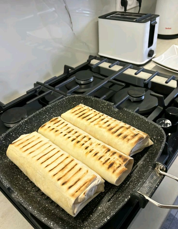 Для начала выложите начинку на края лаваша. Полейте ее приготовленным соусом и аккуратно сверните в плотный рулет, подворачивая концы внутрь. После этого обжарьте получившиеся свертки на сухой горячей сковороде по 3 минуты с каждой стороны.