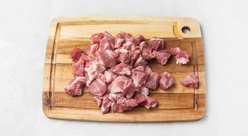 Начните с обработки свинины: удалите пленки и сухожилия, если они есть, и нарежьте мясо на небольшие куски — кубики размером около 2 см. Поместите их в миску и залейте соевым соусом. Перемешайте, чтобы мясо хорошенько замариновалось, оставьте на время.