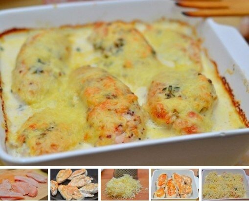 Обжаренное филе переложите в форму для запекания и сверху залейте сливочным соусом.