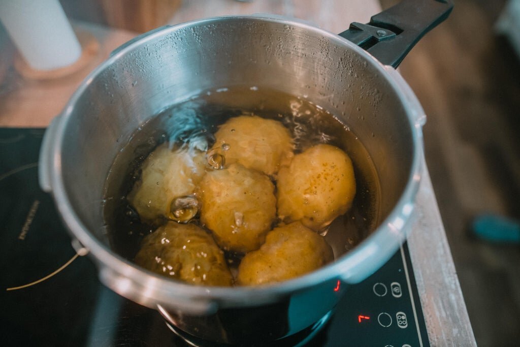 В первую очередь, картофель нужно тщательно помыть и отварить в мундире до готовности, но следите, чтобы он не разварился. Замечательный клубничный вкус проявится при правильном приготовлении. В то время как картофель варится, следует нарезать бекон на мелкие кусочки и обжарить без масла до золотистой корочки. Далее натрите сыр на мелкой терке, а зеленый лук мелко нарежьте.