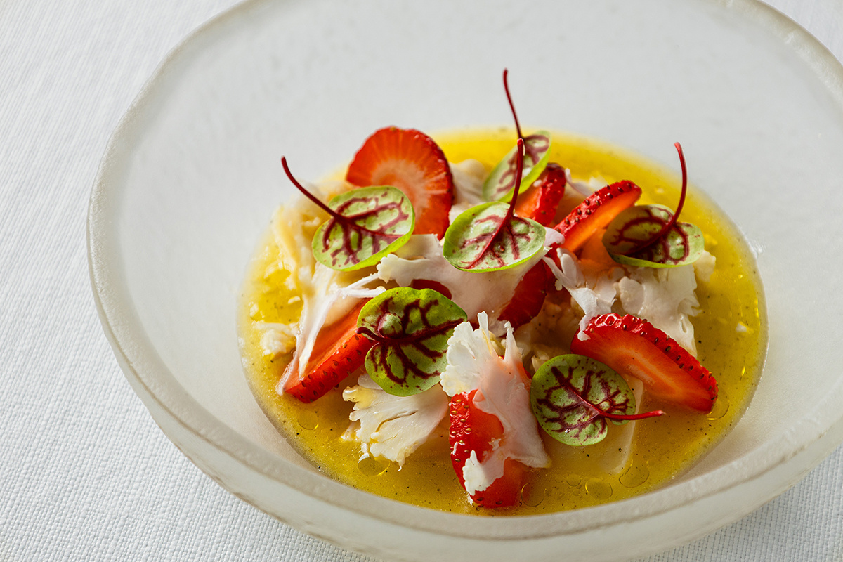 Ароматный сахалинский гребешок нарезают кубиками и маринуют с имбирем. Затем добавляются мелкие соцветия цветной капусты и обеспечивается заправка из цитрусов. Блюдо дополняют свежей клубникой и хрустящими слайсами капусты, подготовленными в ледяной воде. Завершающим штрихом служит капля оливкового масла и микрозелень.