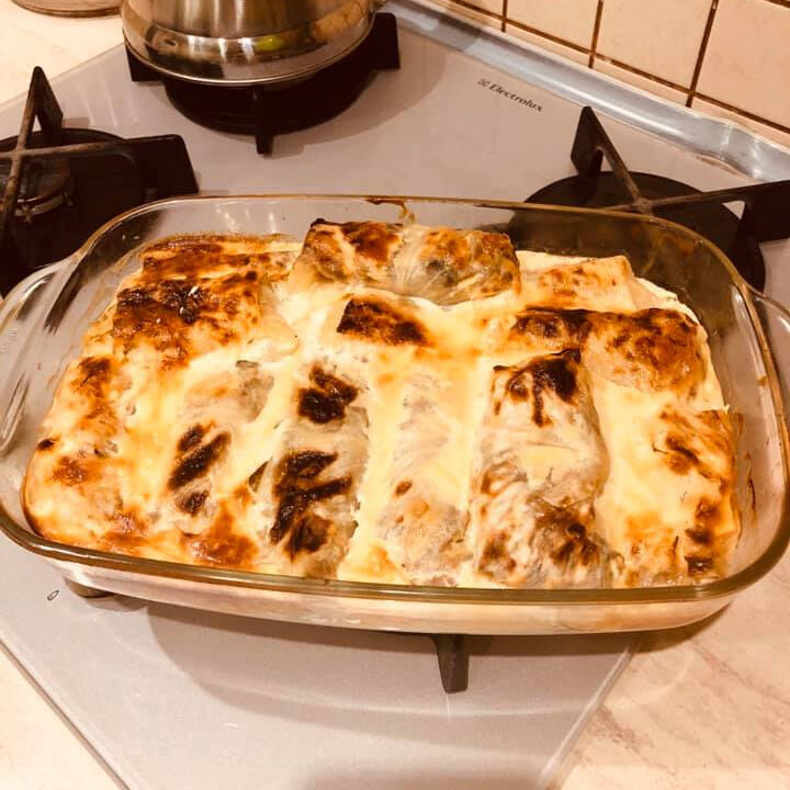 Получившуюся начинку завернуть в капустные листья, а затем выложить аккуратно в форму для запекания. Для залива приготовьте соус из сметаны, взбитой с сырым яйцом и оставшимся сыром.
