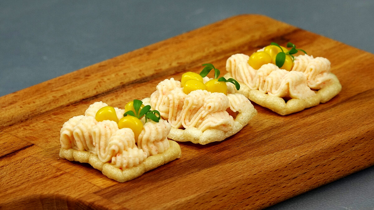 Шаги приготовления: в блендер помещаются крабовые палочки, вареное яйцо, натертый сыр и немного майонеза (или сметаны). Все ингредиенты тщательно измельчаются до получения однородной пасты. Затем, с помощью кондитерского шприца, паста аккуратно выкладывается на хрустящие закусочные блюда или несладкие крекеры, а сверху декорируется консервированной кукурузой и свежей зеленью.
