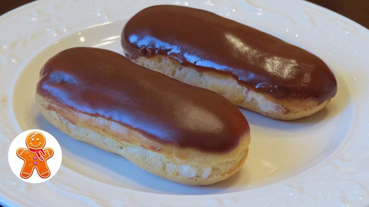 Для глазури растопить шоколад с маслом и аккуратно покрыть эклеры глазурью, после чего дать им застыть в холодильнике.