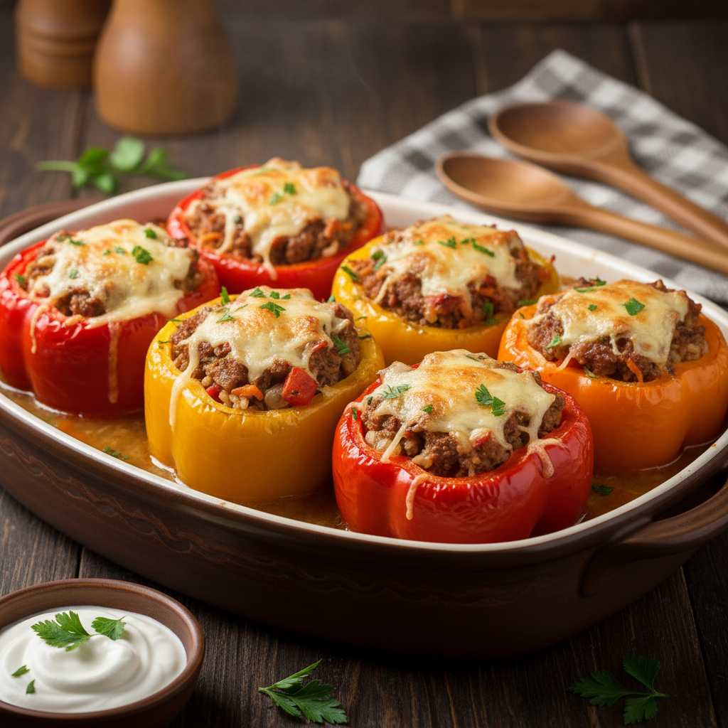 3. Фарширование и запекание: наполнить перцы начинкой, не утрамбовывая слишком плотно. Уложить их в форму для запекания и добавить бульон или воду, чтобы жидкость покрывала дно на 1-2 сантиметра. Накрыть форму фольгой и запечь в разогретой духовке при 180°C в течение 45-60 минут. Затем убрать фольгу, посыпать сыром и вернуться в духовку на 10-15 минут до образования золотистой корочки.