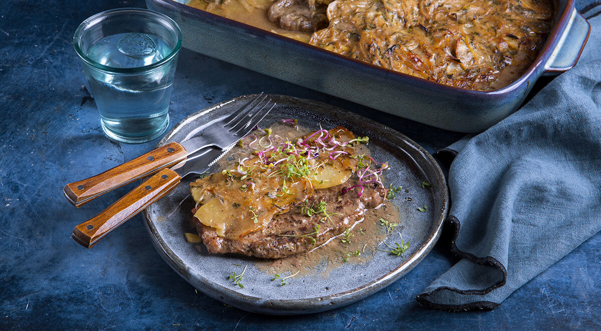 3. Выложите мясо на противень, равномерно распределите сверху картофель и лук. Полейте смесью из молока и куриного бульона, добавив томлённые семена сельдерея, петрушку и тимьян.