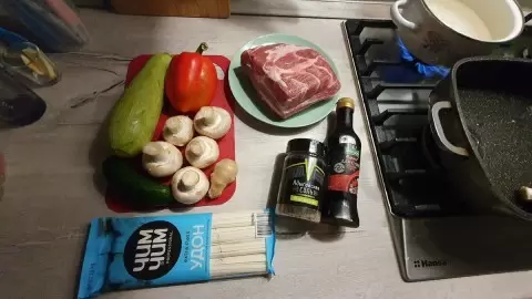 Приготовьте лапшу, следуя указаниям на упаковке.Нарежьте свинину на тонкие полоски, предпочтительно из слегка подмороженного куска для удобства.На разогретой сковороде обжарьте мясо с любимыми специями (но не добавляйте соль) в течение 5–7 минут.Добавьте нарезанные грибы и готовьте до их полной готовности, лучше использовать вешенки для глубокого вкуса.Положите в сковороду кабачки и имбирь, тушите 2–3 минуты.Добавьте огурцы и сладкий перец.Затем положите готовую лапшу сразу после перца, чтобы он сохранил хруст.Полейте блюдо соевым соусом, тщательно перемешайте и готовьте еще 1–2 минуты.Перед подачей посыпьте кунжутом для дополнительного аромата.Полезные советы