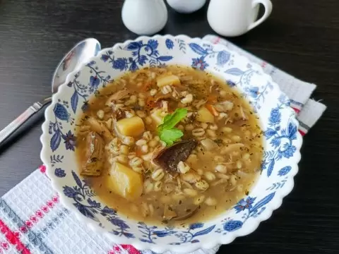 После этого отправьте перловку в кипящий бульон и варите её почти до готовности. Затем следует нарезать картофель кубиками и добавить его в суп. Не забывайте про грибы: их можно добавить вместе с отваром, в котором они замачивались, но тщательно следите за тем, чтобы на дне не оставалось песка.
