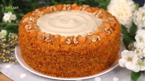 - Коржи: 500 г моркови, 170 г манной крупы, 170 г муки, 150 г растительного масла, 150 г сахара, 80 г грецких орехов, 2 апельсина, 1/2 ч.л. корицы, 1/3 ч.л. соли, 10 г разрыхлителя.
