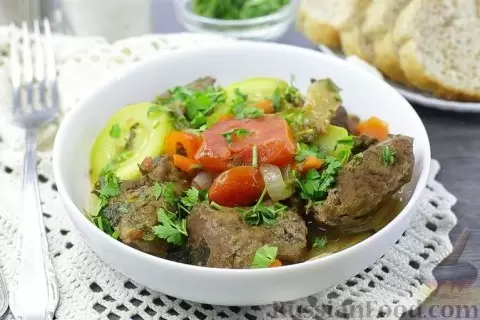 - Говяжья печень, тушенная с овощами — это идеальный вариант для тех, кто ценит домашнюю кухню. Печень, приготовленная с кабачками, помидорами и сладким перцем, создаст настоящую симфонию вкуса. Все ингредиенты выкладываются в казан без предварительной обжарки и тушатся в собственном соку.