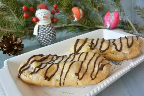 Время побаловать родных изысканным десертом! Сегодня на повестке дня — воздушные эклеры, которые удивят даже самых взыскательных сладкоежек. В начинке у нас — вареная сгущенка, а верхушка щедро полита белой глазурью и украшена шоколадом. Такой выбор станет настоящим украшением ваших новогодних застолий.