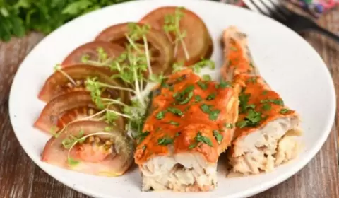 Готовый минтай в сметанном соусе аккуратно перекладывается на тарелки с гарниром или овощами и подаётся к столу. Блюдо получается невероятно ароматным и вкусным.