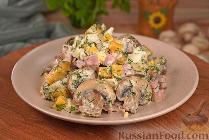 - Салат с ветчиной и грибами: Легкий, но сытный вариант, который отлично подчеркивает вкус свежих ингредиентов.