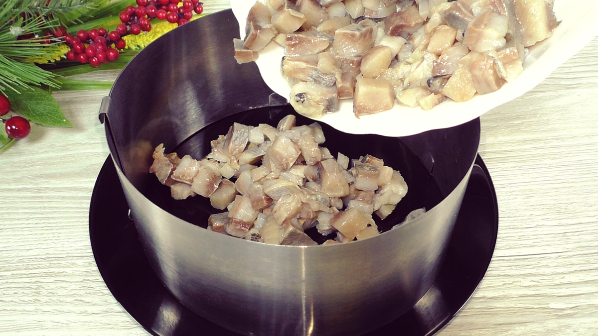 - Первый слой: нарезанная солёная селёдка. Можно заранее очистить её от костей или использовать готовое филе, всю поверхность слоя покрыть майонезом.